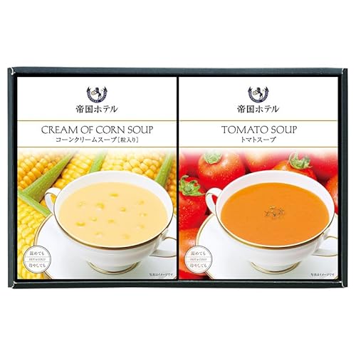 帝国ホテル 温冷タイプスープセット 熟練の技が生み出す、帝国ホテル伝統の味をお楽しみください。◆内容:コーンクリームスープ(粒入り)(150g)・トマトスープ(150g)×各1